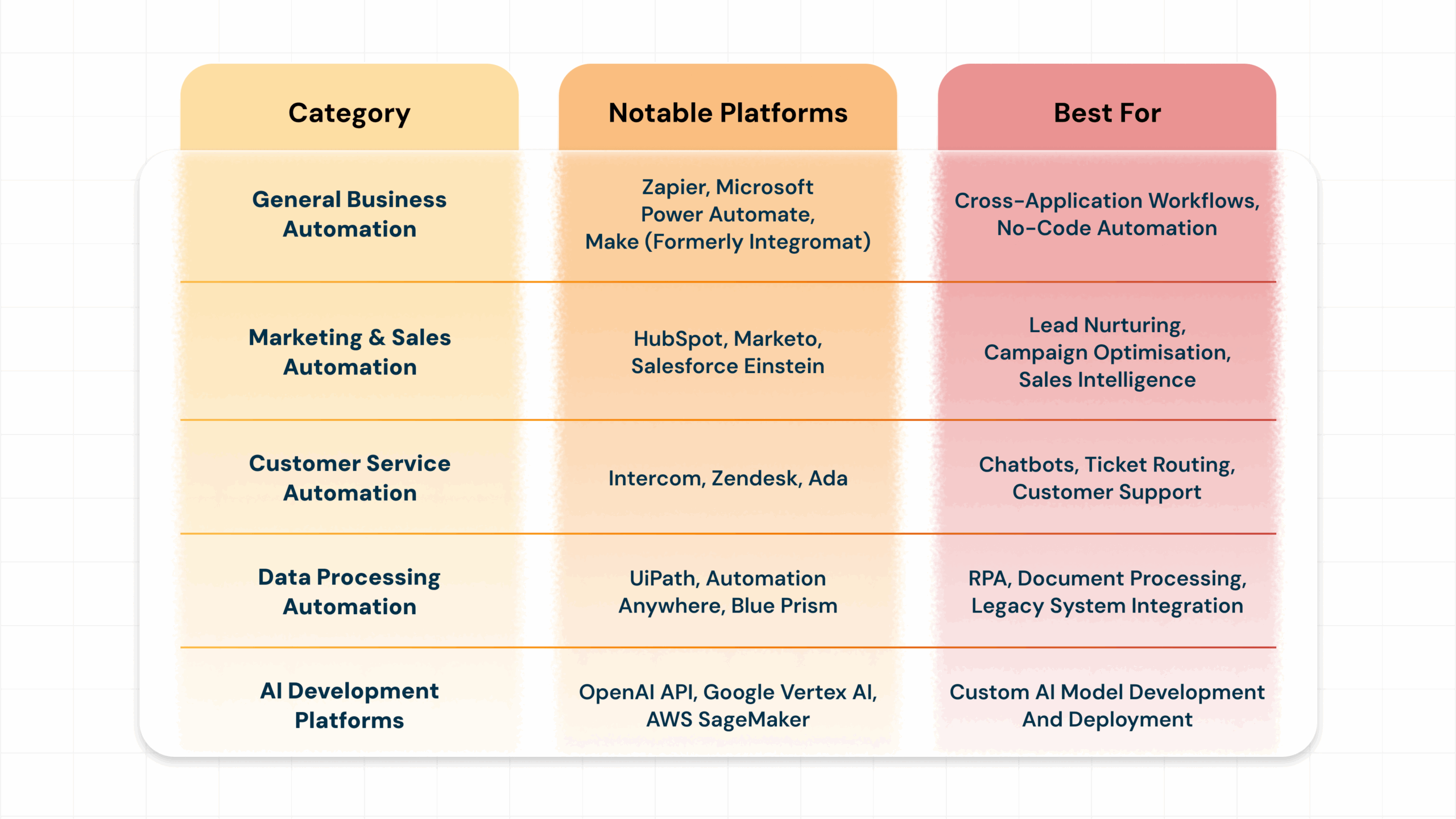 The AI automation landscape offers solutions for various business needs and technical capabilities. Here’s a rundown of standout platforms across different categories: